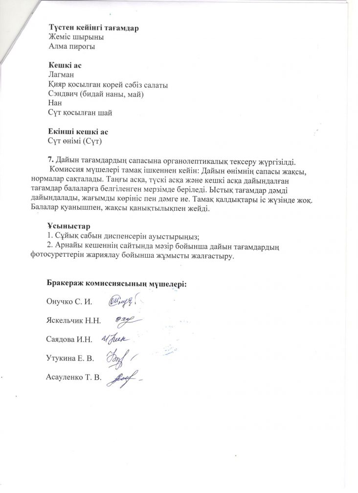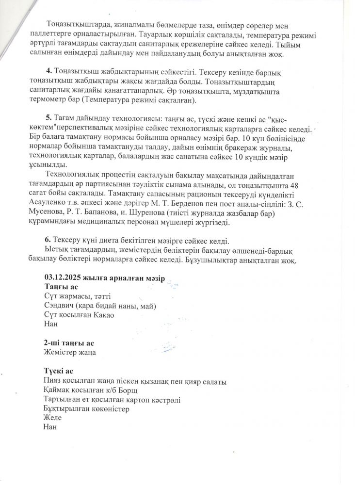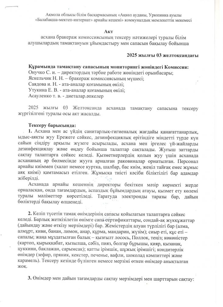 Білім алушыларды тамақтандыруды ұйымдастыру мен сапасын бақылау жөніндегі асханалық бракерлік комиссияның тексеру нәтижелері туралы акты 03.12.2025 ж.