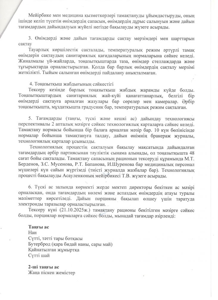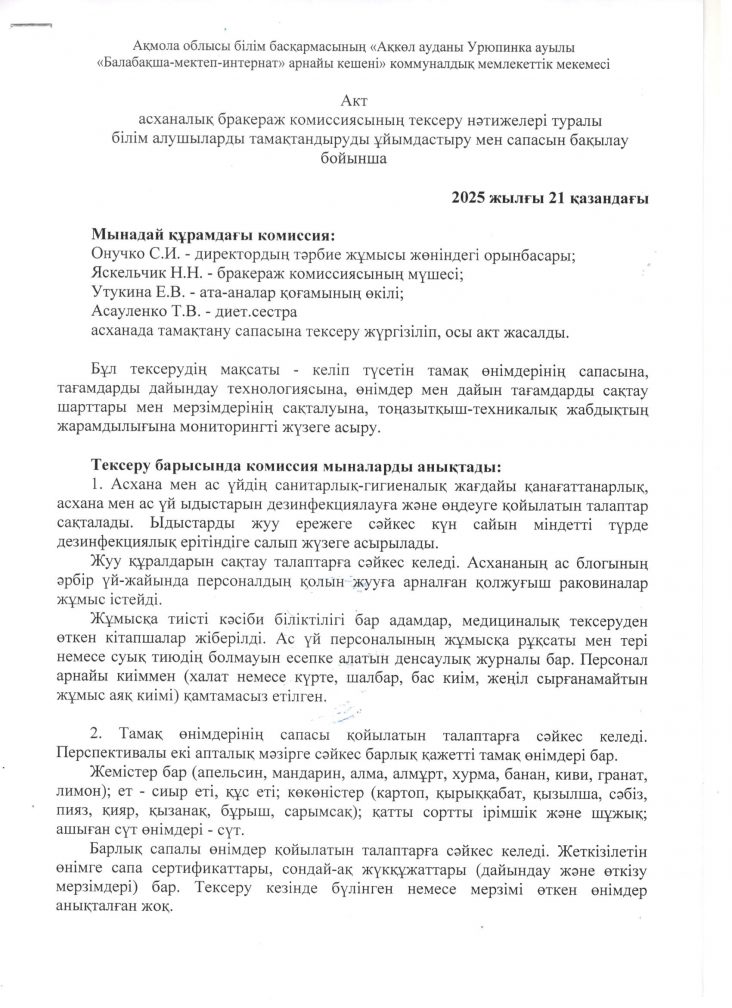 Білім алушыларды тамақтандыруды ұйымдастыру мен сапасын бақылау жөніндегі асханалық бракерлік комиссияның тексеру нәтижелері туралы акты 121.10.2025 ж.