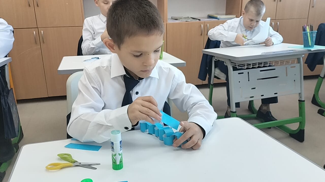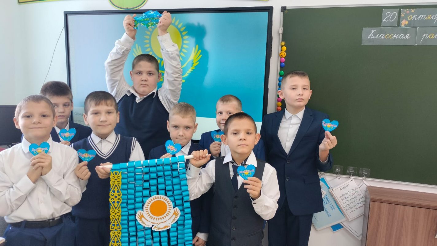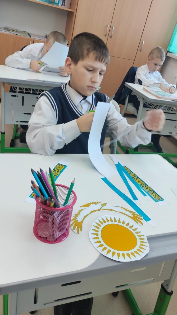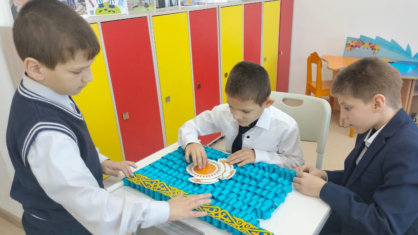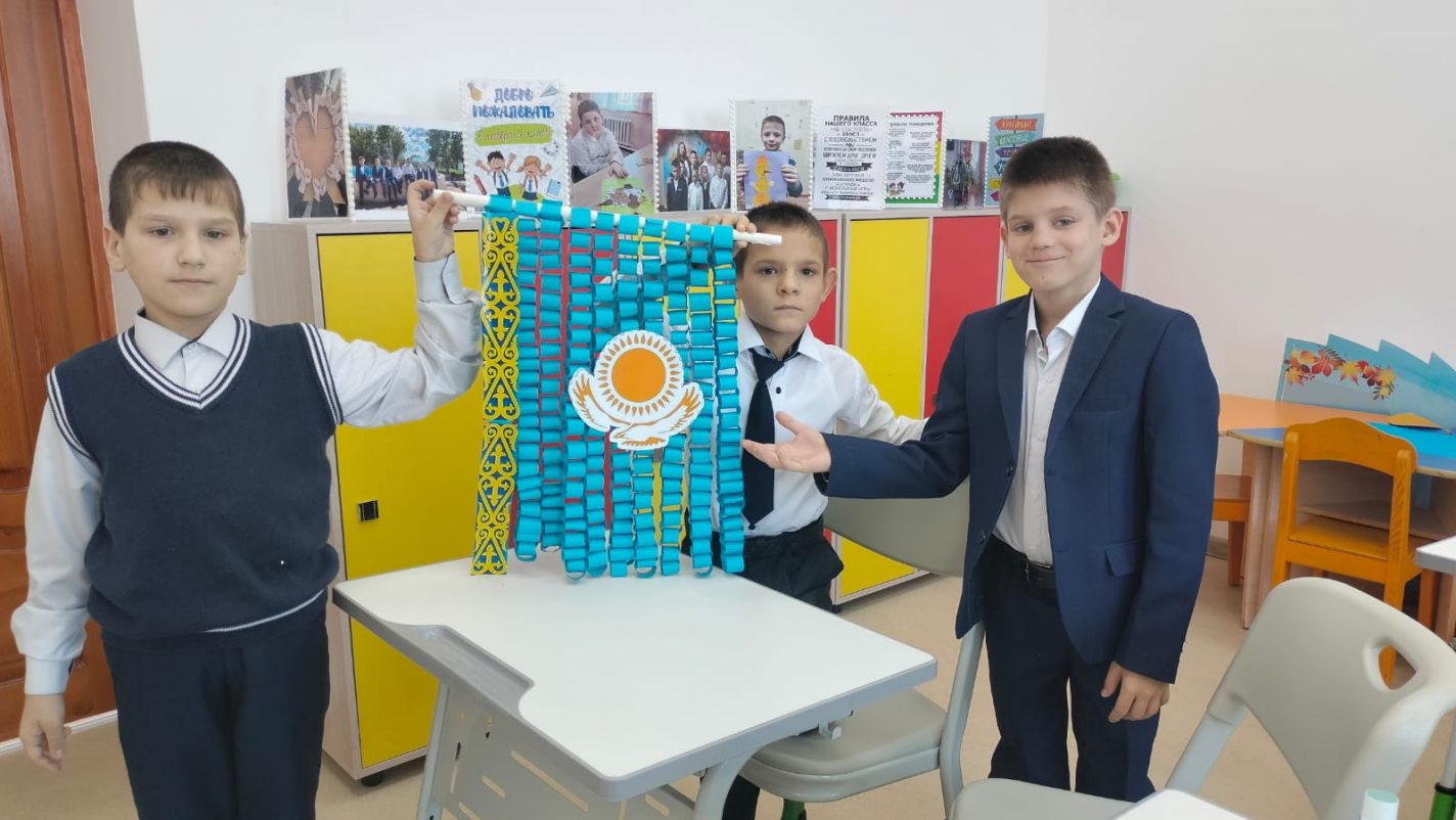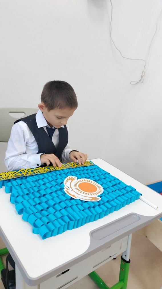 Мемлекеттік мереке – Республика күні қарсаңында 4 «Б» сынып оқушылары түрлі-түсті қағаздан көптеген қағаз сақиналардан, күннің, сәулелердің, қыран бүркіттің бейнелері, ұлттық ою-өрнектерден тұратын көк түсті жалауша жасады. Бұл ту – Қазақстанның мәдениеті мен дәстүрлерінің байлығы мен алуан түрлілігін көрсететін көк, сары және ақ түстердің нышандық комбинациясы. Қазақстан туы – бірегей еліміздің маңыздылығы мен маңызын көрсететін мемлекеттік рәміз.