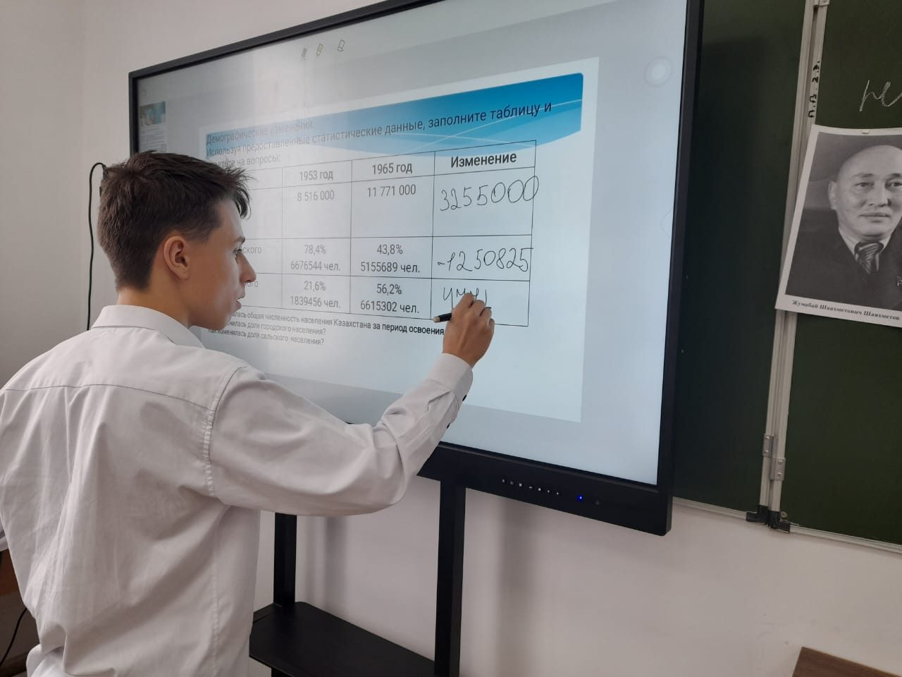 Оқушылар интерактивті тақта арқылы тапсырмаларды орындап, белсенді жұмыс жасады. Олар Қазақстандағы тың және тыңайған жерлерді игерудің себептерін анықтап, «Тың игеру» науқанының барысы мен оның негізгі кезеңдерін саралады. Пікірталас өткізілді, онда студенттер «Тың игеру» науқанының Қазақстанға экономикалық, әлеуметтік, демографиялық және экологиялық әсерін зерттеді. Сабақ соңында қорытынды шығарылып, Тың игеру науқаны республика халқының өмірі мен ел дамуына тигізген әсері бағаланды. Сабақтың кезеңдерінің бірізділігі және әрекеттердің ауысуы оқушылардың тез және тиімді жұмыс істеуіне мүмкіндік берді. Сабақ нәтижелі, еркін, достық атмосферада өтті.
