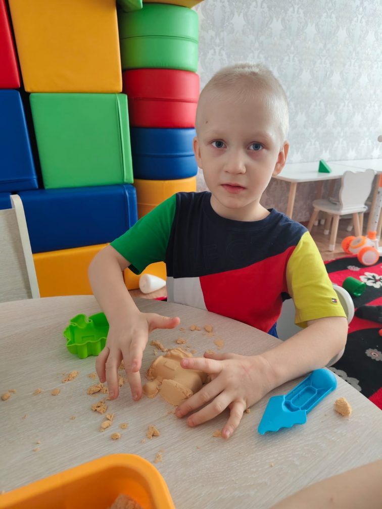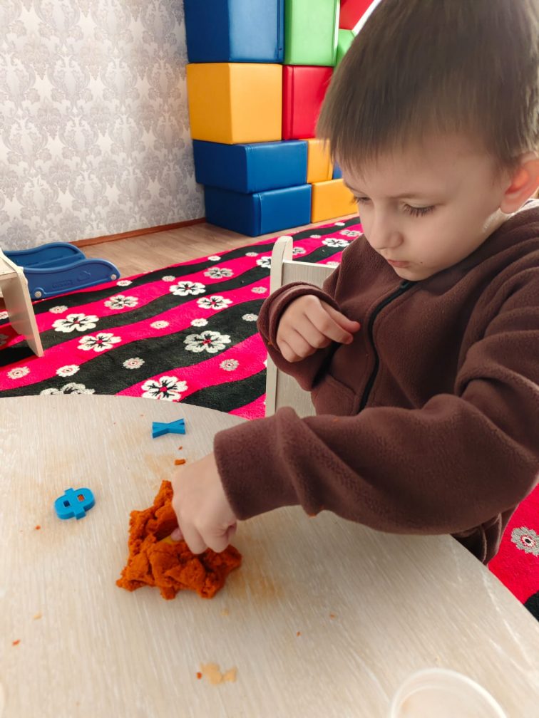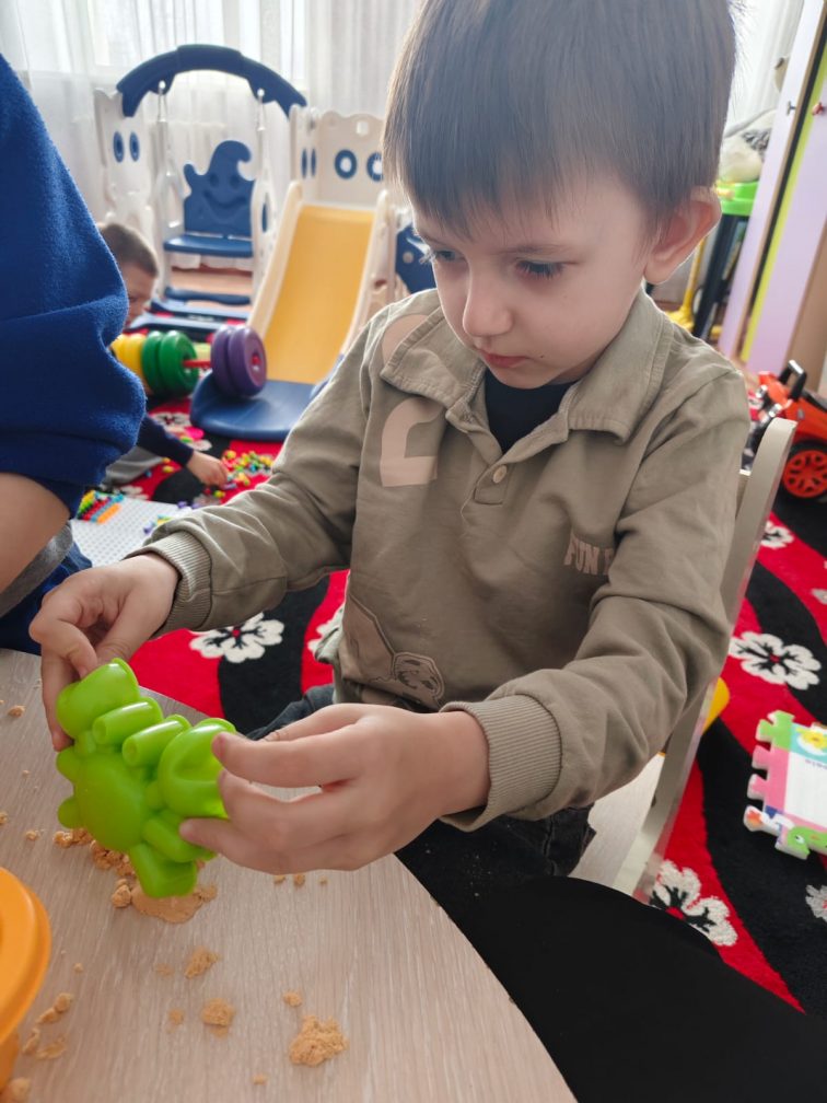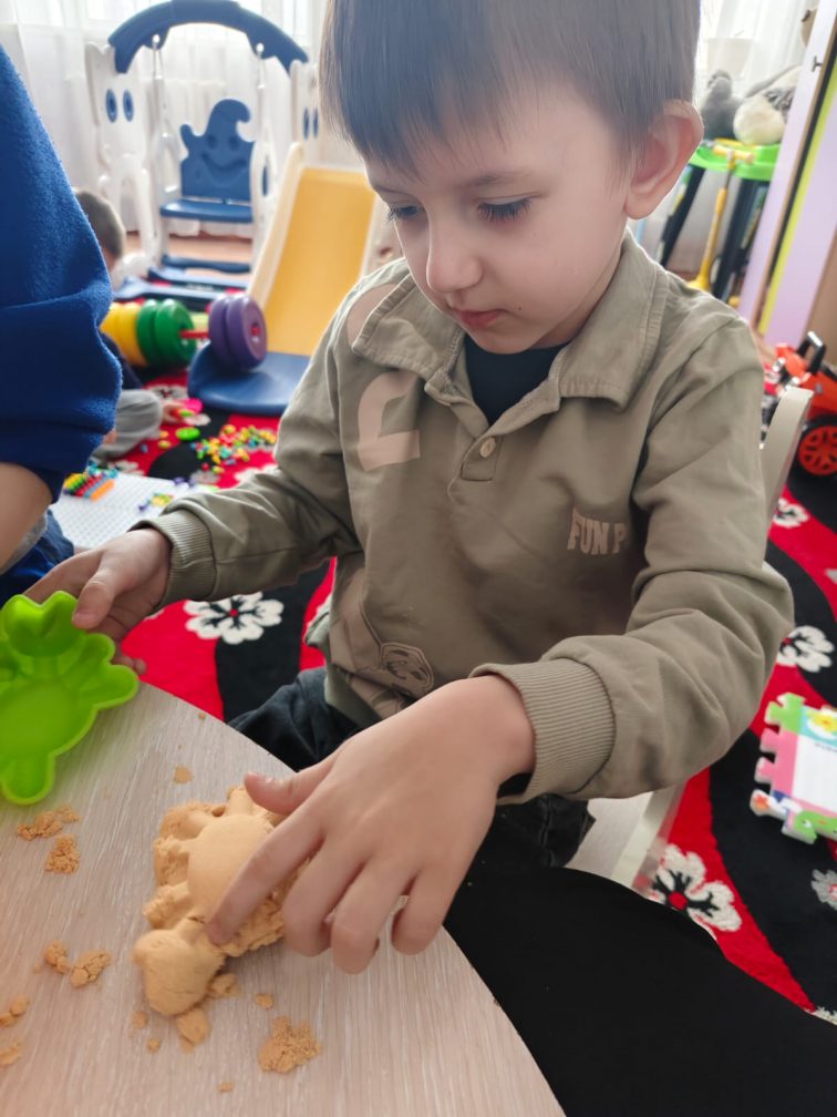 Бүгін ойын іс-шаралары кезінде балалар кинетикалық құммен жұмыс істеді. Олар әртүрлі қалыптарды толтырды, құмнан сарайлар жасады, сарайлар және басқа да құрылымдар салды. Бұл іс-шара ұсақ моториканы, қиялды, дәлдікті және шығармашылықты дамытуға көмектеседі.